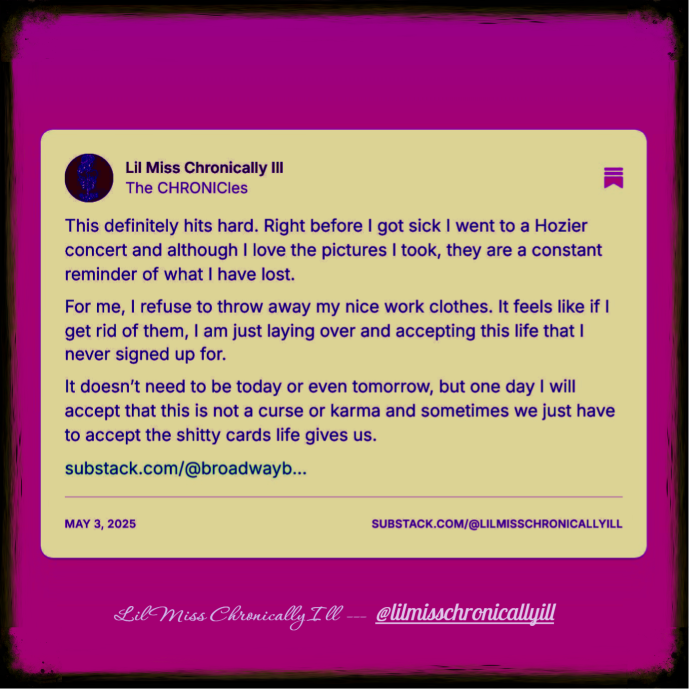 This definitely hits hard. Right before I got sick I went to a Hozier concert and although I love the pictures I took, they are a constant reminder of what I have lost.